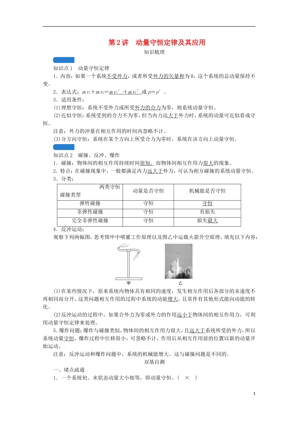 第2讲动量守恒定律及其应用知识梳理知识点1动量守恒定律1.内容:如果一个系统不受外力,或者所受外力的矢量和为0,这个系统的总动量保持不变。2.表达式:m1v1+m2v2=m1v1′+m2v2′或p=p′。3.适用条件:(1)...