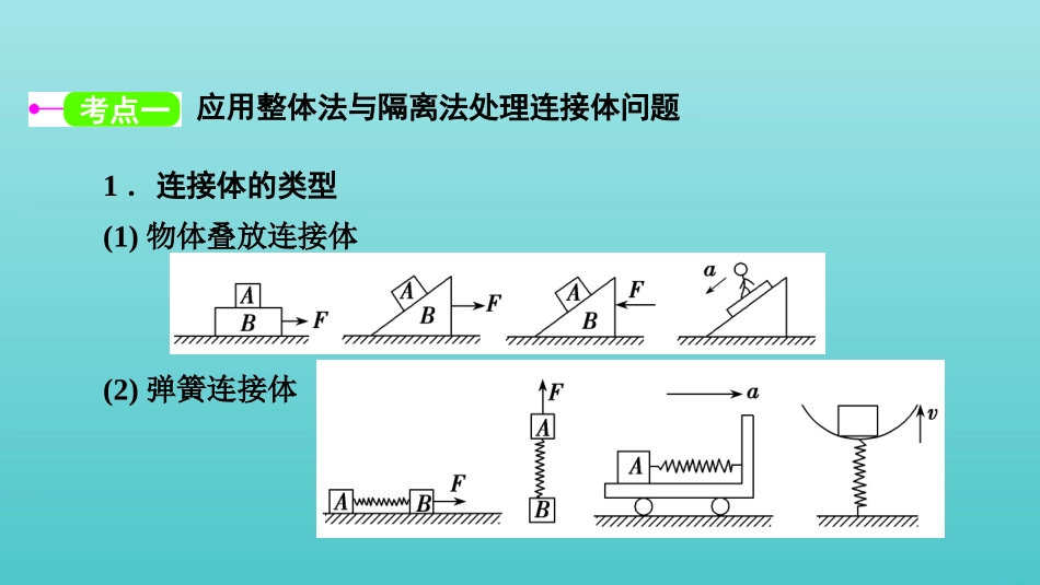 第3讲牛顿运动定律的综合应用1核心考点·重点突破1.连接体的类型(1)物体叠放连接体(2)弹簧连接体考点一应用整体法与隔离法处理连接体问题(3)轻绳(杆)连接体2.连接体的运动特点(1)轻绳——在伸直状态下,两端的...