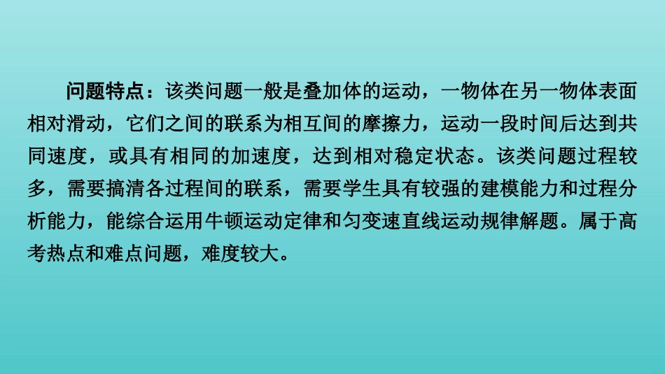 专题强化一板块模型问题特点:该类问题一般是叠加体的运动,一物体在另一物体表面相对滑动,它们之间的联系为相互间的摩擦力,运动一段时间后达到共同速度,或具有相同的加速度,达到相对稳定状态。该类问题过程...