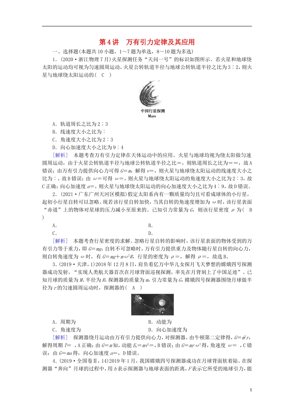 第4讲万有引力定律及其应用一、选择题(本题共10小题,1~7题为单选,8~10题为多选)1.(2020·浙江物理7月)火星探测任务“天问一号”的标识如图所示。若火星和地球绕太阳的运动均可视为匀速圆周运动,火星公转轨...
