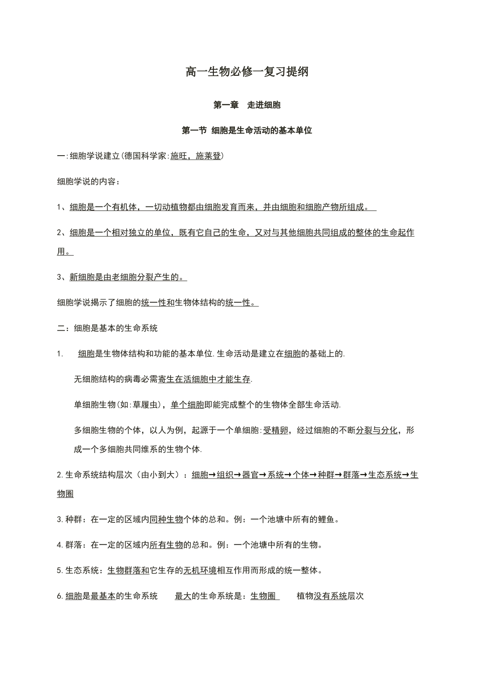 高一生物必修一复习提纲第一章走进细胞第一节细胞是生命活动的基本单位一:细胞学说建立(德国科学家:施旺,施莱登)细胞学说的内容:1、细胞是一个有机体,一切动植物都由细胞发育而来,并由细胞和细胞产物所组成。...