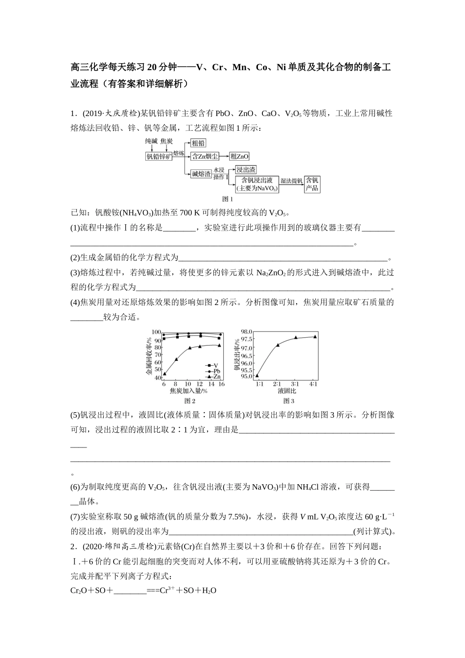 高三化学每天练习20分钟——V、Cr、Mn、Co、Ni单质及其化合物的制备工业流程(有答案和详细解析)1.(2019·大庆质检)某钒铅锌矿主要含有PbO、ZnO、CaO、V2O5等物质,工业上常用碱性熔炼法回收铅、锌、钒等金属,...