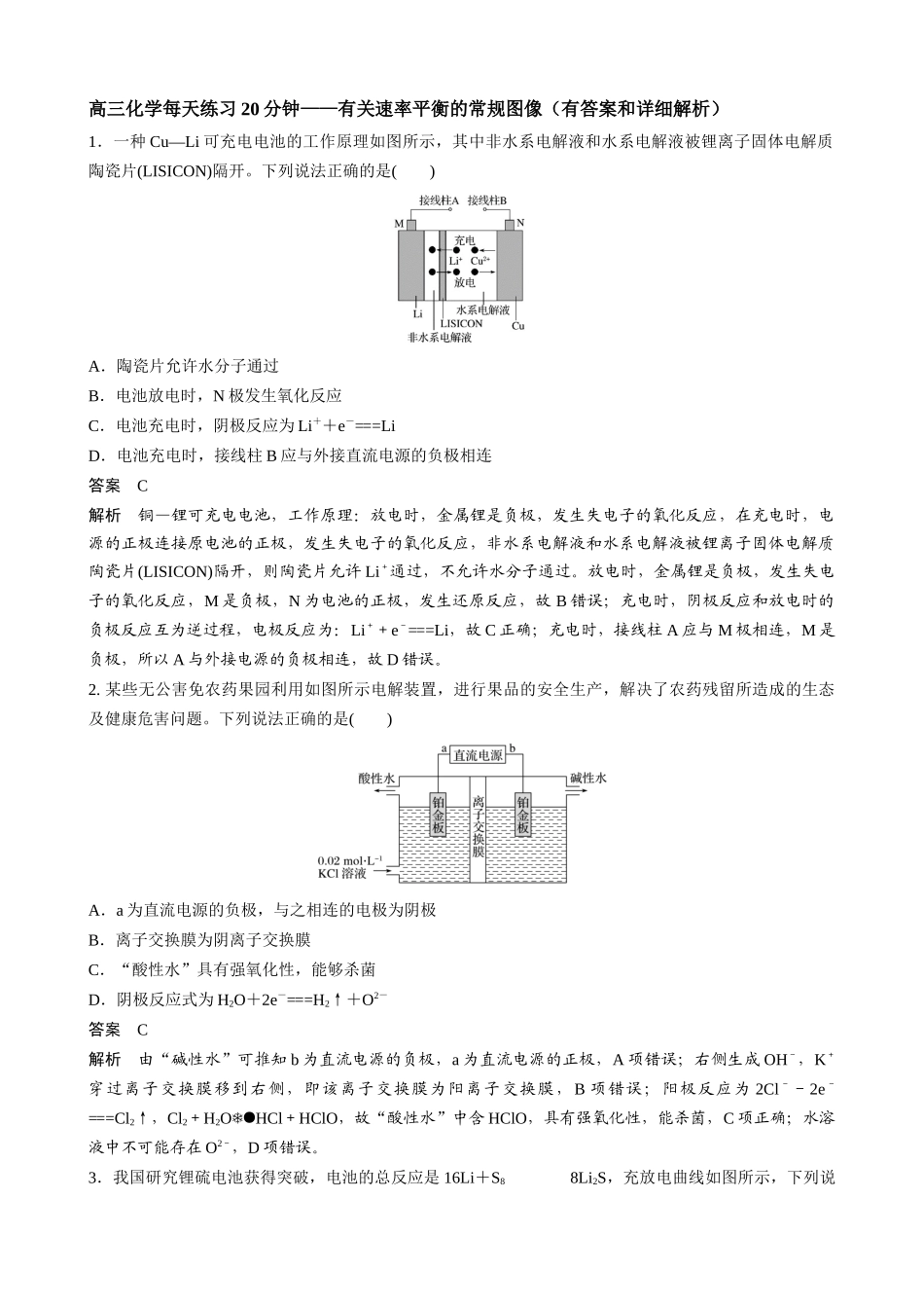 高三化学每天练习20分钟——有关速率平衡的常规图像(有答案和详细解析)1.一种Cu—Li可充电电池的工作原理如图所示,其中非水系电解液和水系电解液被锂离子固体电解质陶瓷片(LISICON)隔开。下列说法正确的是()A...