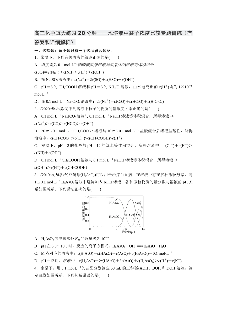 高三化学每天练习20分钟——水溶液中离子浓度比较专题训练(有答案和详细解析)一、选择题:每小题只有一个选项符合题意。1.常温下,下列有关溶液的叙述正确的是()A.浓度均为0.1mol·L-1的硫酸氢铵溶液与氢氧...
