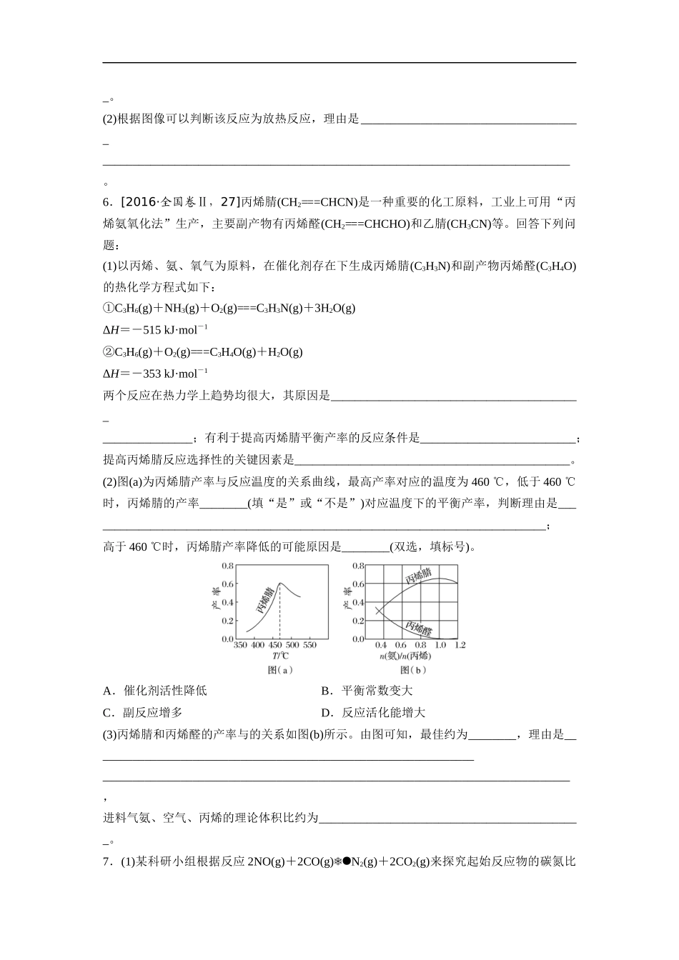 高三化学每天练习20分钟——新情景下的综合图像及适宜条件的优化(有答案和详细解析)一、选择题:每小题有一个或两个选项符合题意。1.一定条件下合成乙烯:6H2(g)+2CO2(g)CH2===CH2(g)+4H2O(g);已知温度...