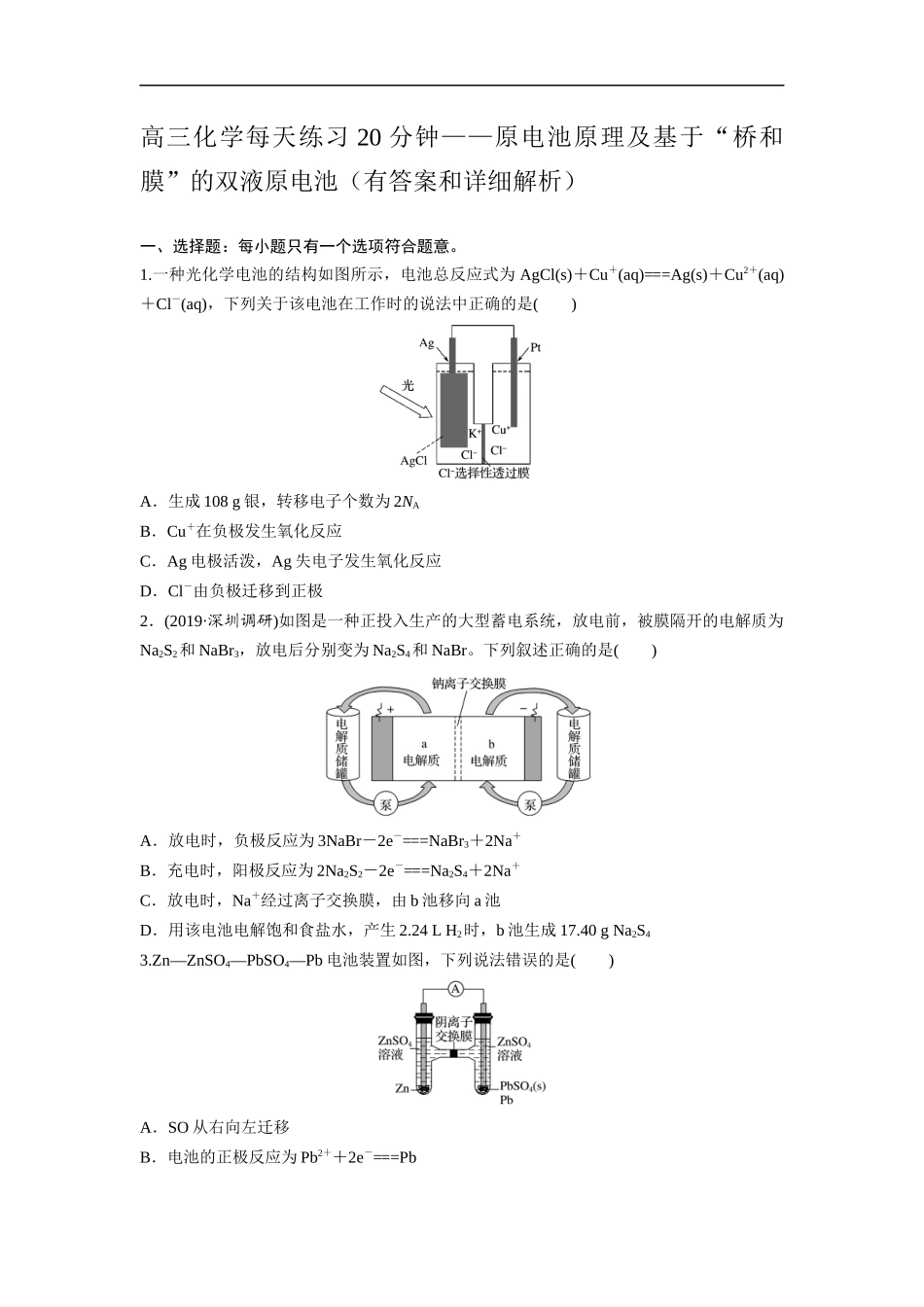 高三化学每天练习20分钟——原电池原理及基于“桥和膜”的双液原电池(有答案和详细解析)一、选择题:每小题只有一个选项符合题意。1.一种光化学电池的结构如图所示,电池总反应式为AgCl(s)+Cu+(aq)===Ag(s)+...