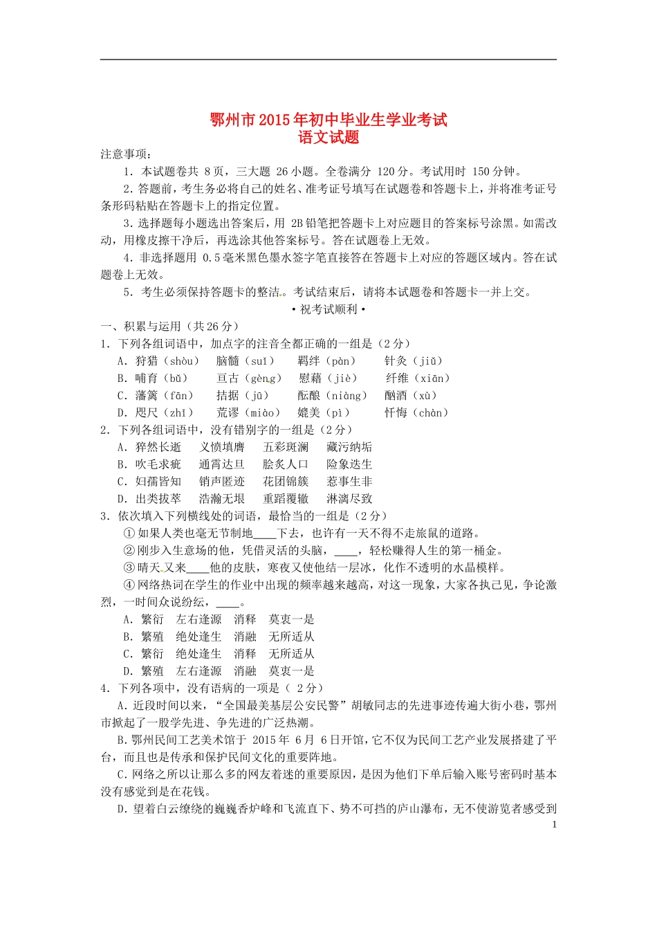 鄂州市2015年初中毕业生学业考试语文试题注意事项:1.本试题卷共8页,三大题26小题。全卷满分120分。考试用时150分钟。2.答题前,考生务必将自己的姓名、准考证号填写在试题卷和答题卡上,并将准考证号条形码粘...