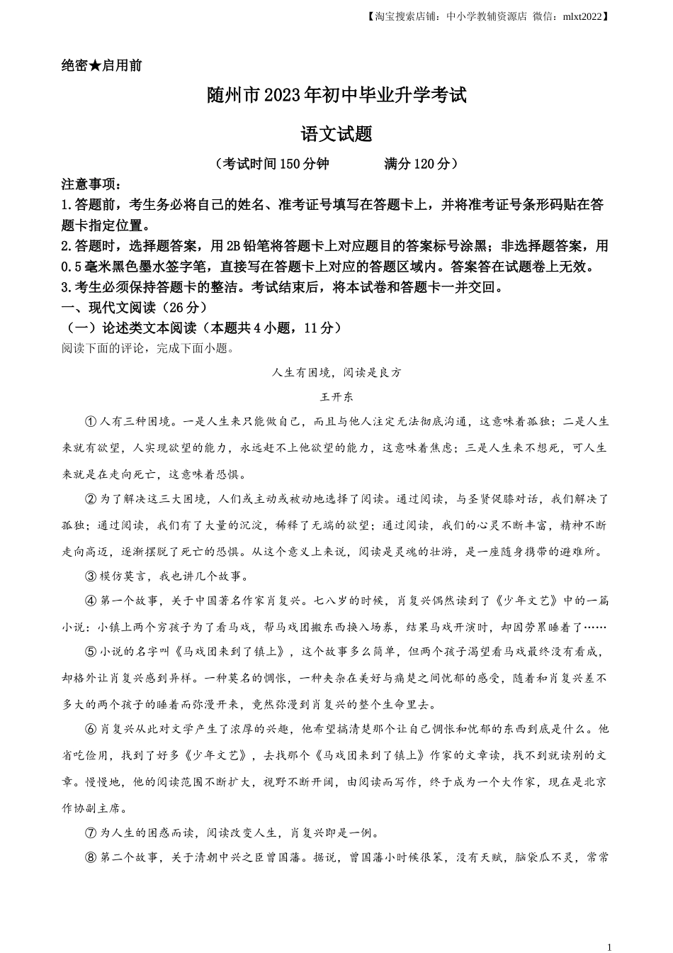 【淘宝搜索店铺:中小学教辅资源店微信:mlxt2022】绝密★启用前随州市2023年初中毕业升学考试语文试题(考试时间150分钟满分120分)注意事项:1.答题前,考生务必将自己的姓名、准考证号填写在答题卡上,并将准...