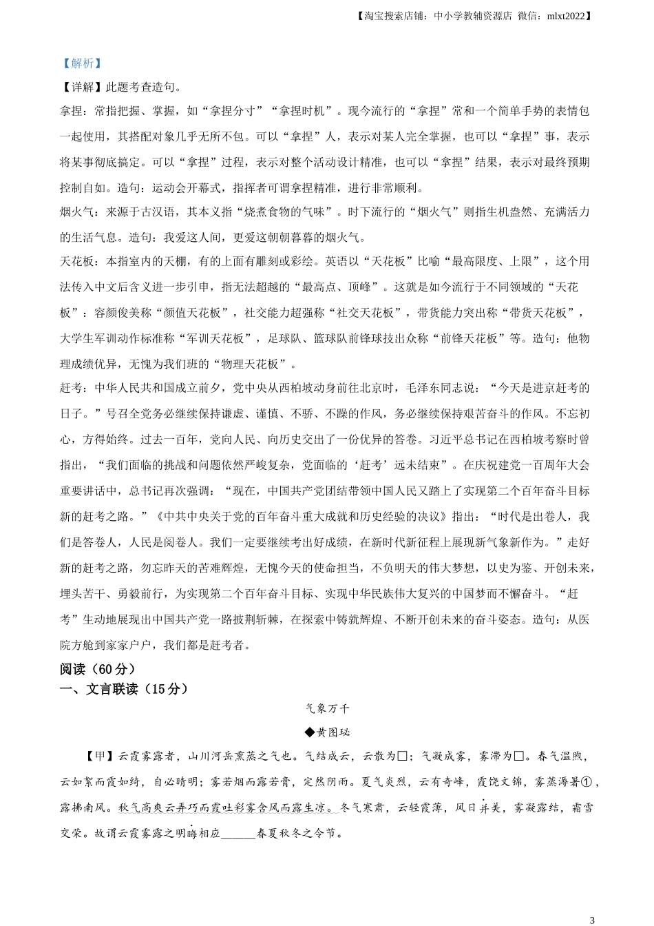 【淘宝搜索店铺:中小学教辅资源店微信:mlxt2022】2023年湖北省宜昌市初中学业水平考试语文试题(本试卷共35小题,满分120分,考试时间150分钟)注意事项:本试卷分试题卷和答题卡两部分,请将答案写在答题卡上...