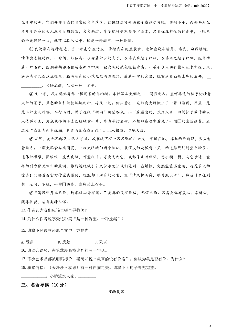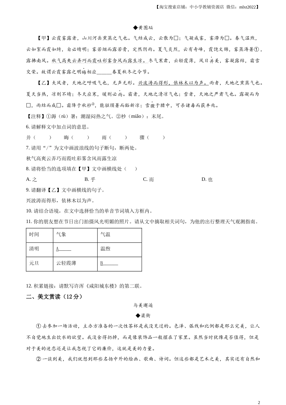 【淘宝搜索店铺:中小学教辅资源店微信:mlxt2022】2023年湖北省宜昌市初中学业水平考试语文试题(本试卷共35小题,满分120分,考试时间150分钟)注意事项:本试卷分试题卷和答题卡两部分,请将答案写在答题卡上...