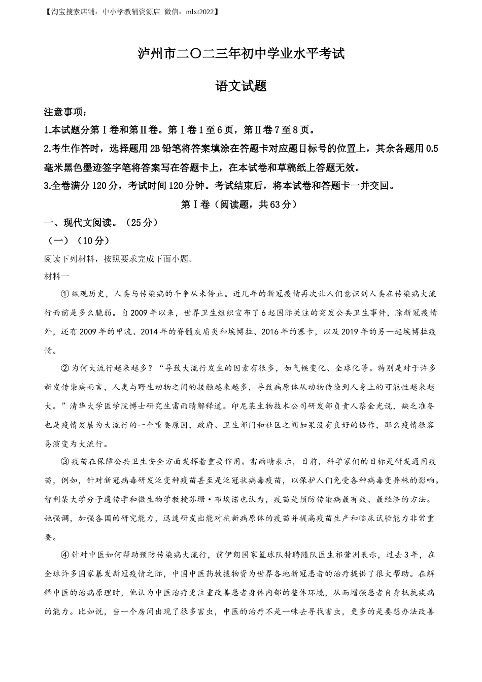 【淘宝搜索店铺:中小学教辅资源店微信:mlxt2022】泸州市二〇二三年初中学业水平考试语文试题注意事项:1.本试题分第Ⅰ卷和第Ⅱ卷。第Ⅰ卷1至6页,第Ⅱ卷7至8页。2.考生作答时,选择题用2B铅笔将答案填涂在答题...