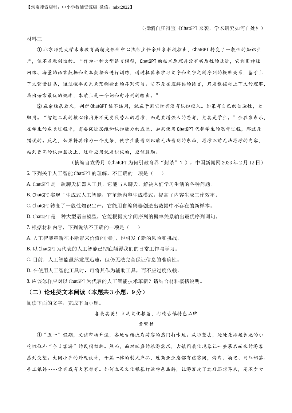 【淘宝搜索店铺:中小学教辅资源店微信:mlxt2022】绝密★启用前【考试时间:2023年6月11日9:00-11:30】四川省自贡市初2023届毕业生学业考试语文注意事项:本试卷满分150分,考试时间为150分钟。答卷前,考生务...