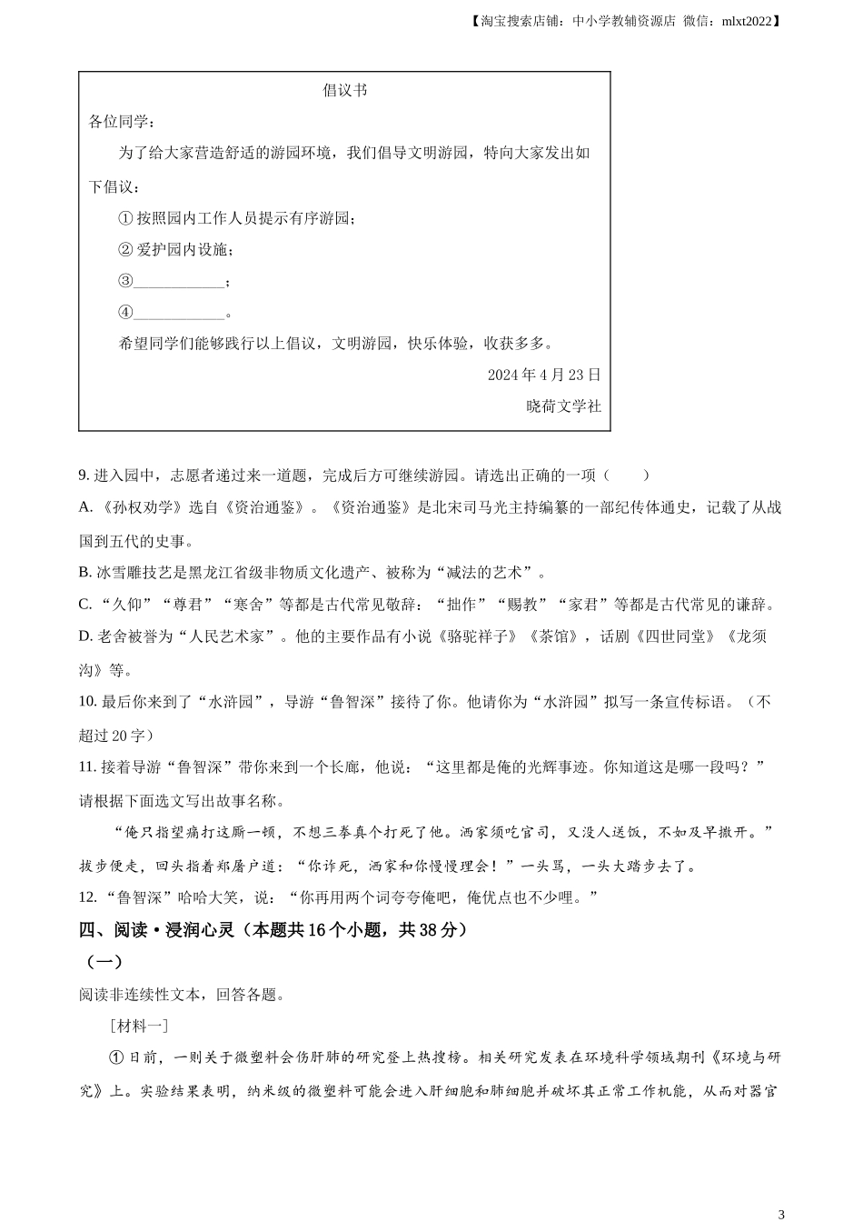 【淘宝搜索店铺:中小学教辅资源店微信:mlxt2022】二○二四年绥化市初中毕业学业考试语文试题考生注意:1.考试时间120分钟2.本试题共五道大题,29个小题,总分120分3.所有答案都必须写在答题卡上所对应的题号...