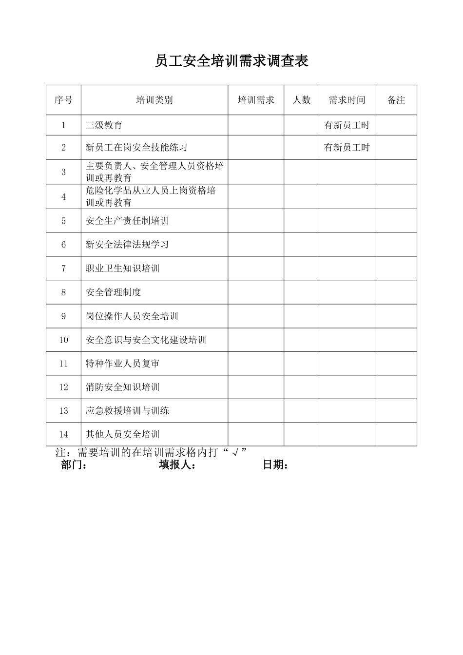 员工安全培训需求调查表序号培训类别培训需求人数需求时间备注1三级教育有新员工时2新员工在岗安全技能练习有新员工时3主要负责人、安全管理人员资格培训或再教育4危险化学品从业人员上岗资格培训或再教育5安全生...