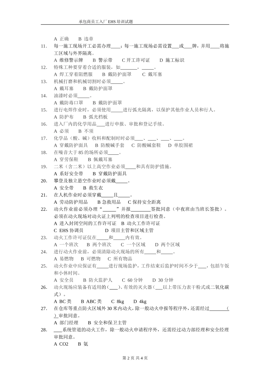 承包商员工入厂EHS培训试题承包商员工入厂EHS培训考试题(达到90分方为合格准许进厂作业)承包商公司名称:____________姓名:____________日期___________分数:____________百威英博公司的安全政策:创建、保持和...