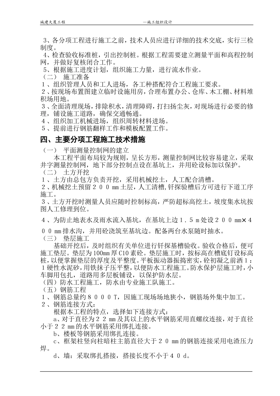 城建大厦工程—施工组织设计城建大厦施工组织设计一、工程概况本工程位于某市海淀区北太平庄北太平桥东北侧,三环路以外。地下4层,地上最高部分27层,总建筑面积12.6万平方米,其中地下37418平方米。...