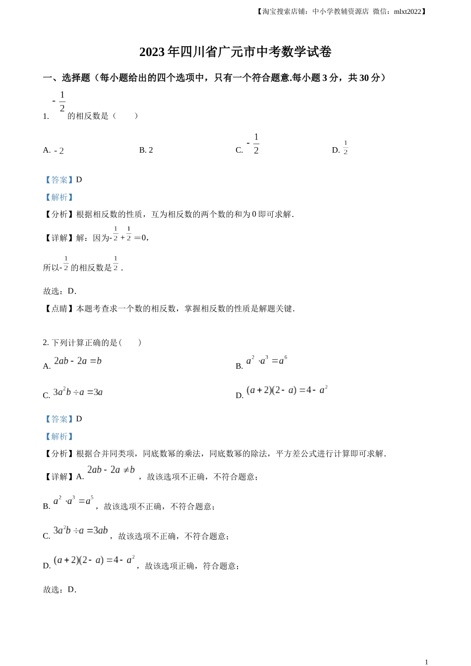 【淘宝搜索店铺:中小学教辅资源店微信:mlxt2022】2023年四川省广元市中考数学试卷一、选择题(每小题给出的四个选项中,只有一个符合题意.每小题3分,共30分)1.的相反数是()A.B.2C.D.【答案】D【解析】【分...