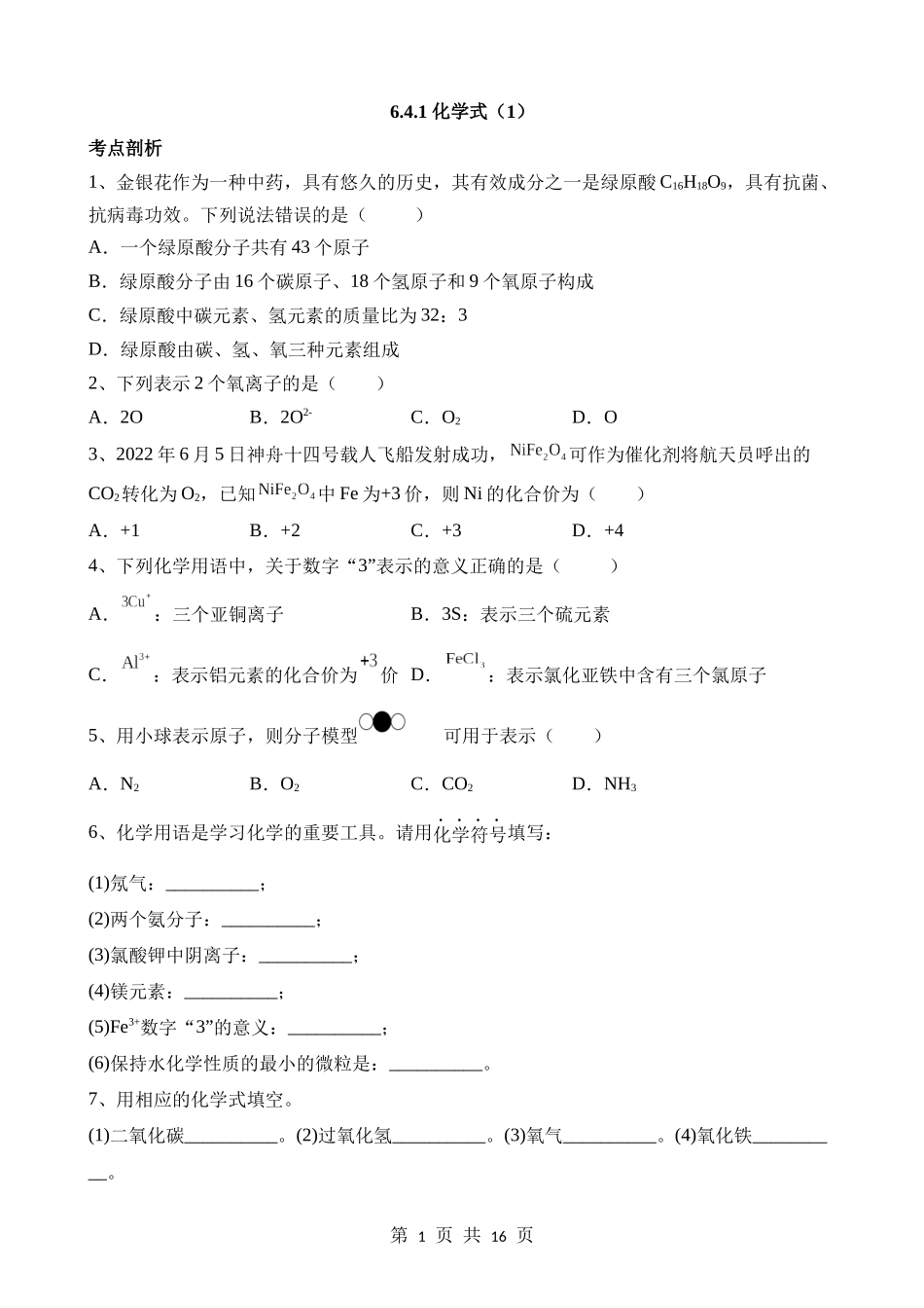 6.4.1化学式(1)考点剖析1、金银花作为一种中药,具有悠久的历史,其有效成分之一是绿原酸C16H18O9,具有抗菌、抗病毒功效。下列说法错误的是()A.一个绿原酸分子共有43个原子B.绿原酸分子由16个碳原子、18个...