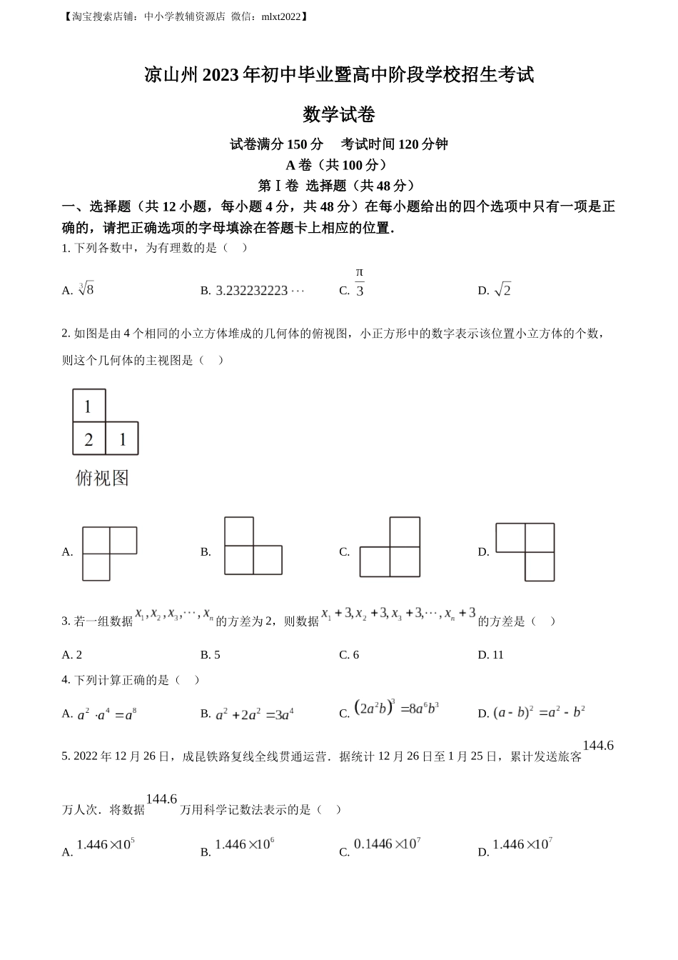 【淘宝搜索店铺:中小学教辅资源店微信:mlxt2022】凉山州2023年初中毕业暨高中阶段学校招生考试数学试卷试卷满分150分考试时间120分钟A卷(共100分)第Ⅰ卷选择题(共48分)一、选择题(共12小题,每小题4分,共...