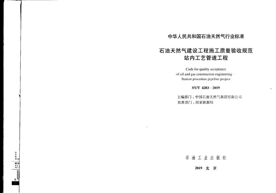 SY/T 4203-2019 石油天然气建设工程施工质量验收规范 站内工艺管道工程.pdf_第1页