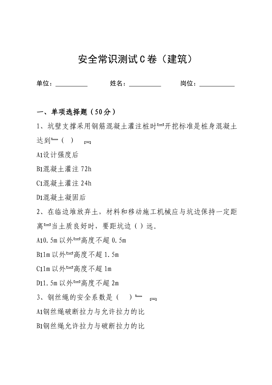 安全常识测试C卷(建筑)单位:姓名:岗位:一、单项选择题(50分)1、坑壁支撑采用钢筋混凝土灌注桩时开挖标准是桩身混凝土达到()A设计强度后B混凝土灌注72hC混凝土灌注24hD混凝土凝固后2、在临...