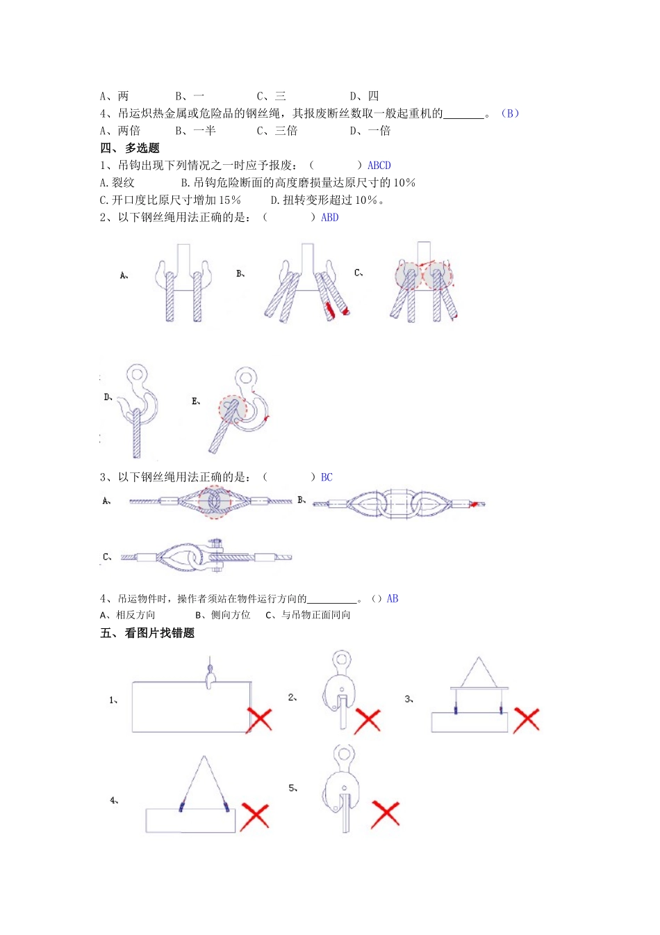 吊索具题库一、填空题:1、当吊钩等取物装置处于最低位置(含地坑)时,钢丝绳在卷筒上的缠绕圈数,除固定绳尾的圈数外,必须留有≥2圈。2、对于交绕的钢丝绳在一个捻距(指任意一个钢丝绳股环绕一周的轴向距离)内的...
