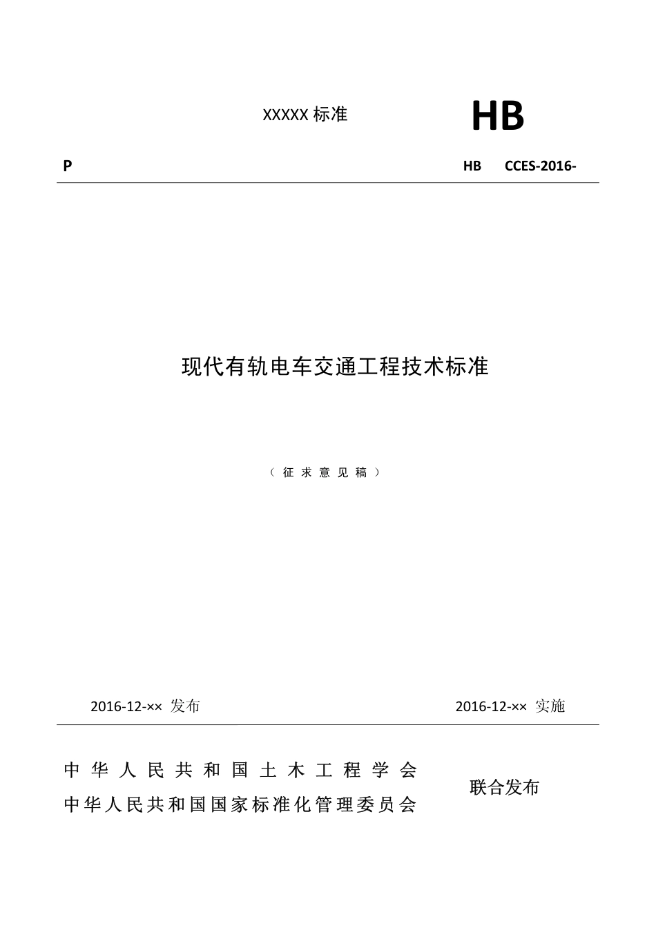 XXXXX标准HBPHBCCES‐2016‐现代有轨电车交通工程技术标准(征求意见稿)2016‐12‐××发布2016‐12‐××实施中华人民共和国土木工程学会中华人民共和国国家标准化管理委员会联合发布团体标准现代有轨电车交通...