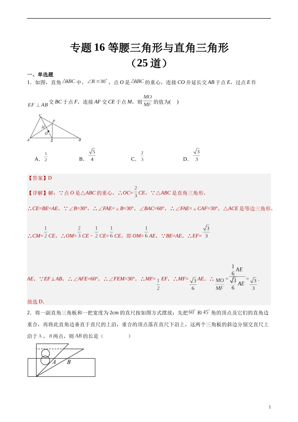 专题16等腰三角形与直角三角形(25道)一、单选题1.如图,直角中,,点O是的重心,连接CO并延长交AB于点E,过点E作交BC于点F,连接AF交CE于点M,则的值为()A.B.C.D.【答案】D【详解】解: 点O是△ABC的重心...