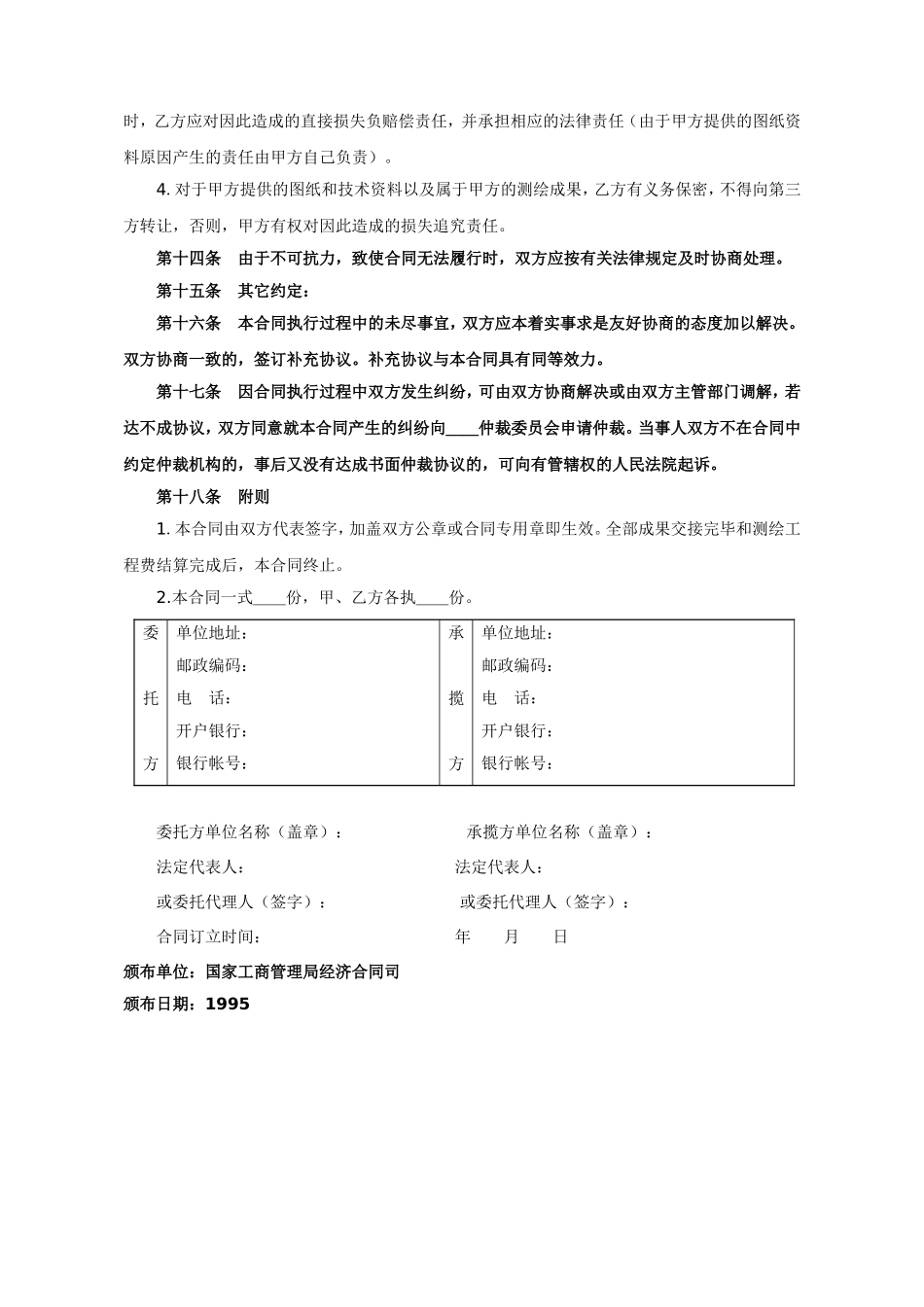 测绘合同(GF—95—0306)委托方(甲方):合同编号:承揽方(乙方):签订地点:根据《中华人民共和国经济合同法》、《中华人民共和国测绘法》和有关法律法规,经甲、乙双方协商一致签订本合同。第一条测绘范围...