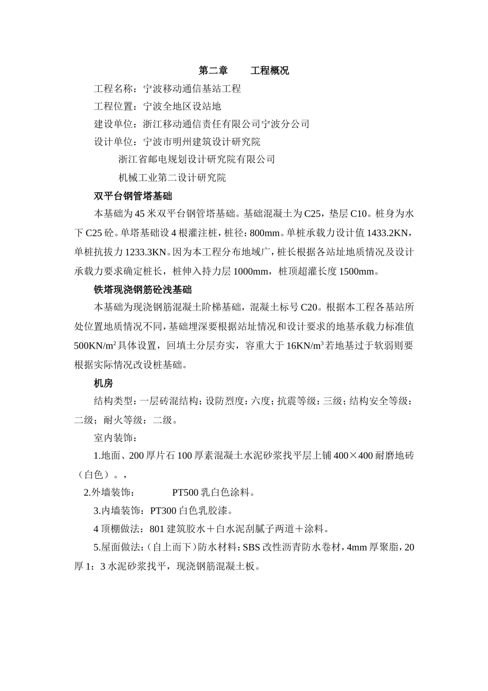第一章编制说明本施工组织设计根据浙江移动通信有限责任公司北仑分公司提供的设计图纸:移动通信基站——基站机房、双平台钢管塔基础、铁塔基础工程设计图情况,建设单位对本工程要求和我公司综合实力进行编制。...