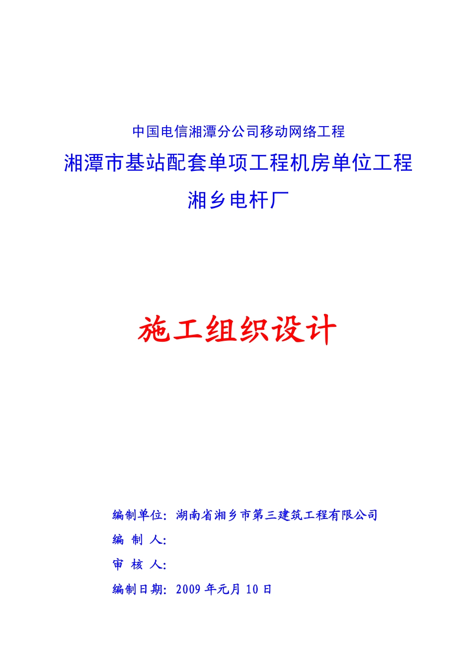 中国电信湘潭分公司移动网络工程湘潭市基站配套单项工程机房单位工程湘乡电杆厂施工组织设计编制单位:湖南省湘乡市第三建筑工程有限公司编制人:审核人:编制日期:2009年元月10日施工组织设计1.工程概况本工程...