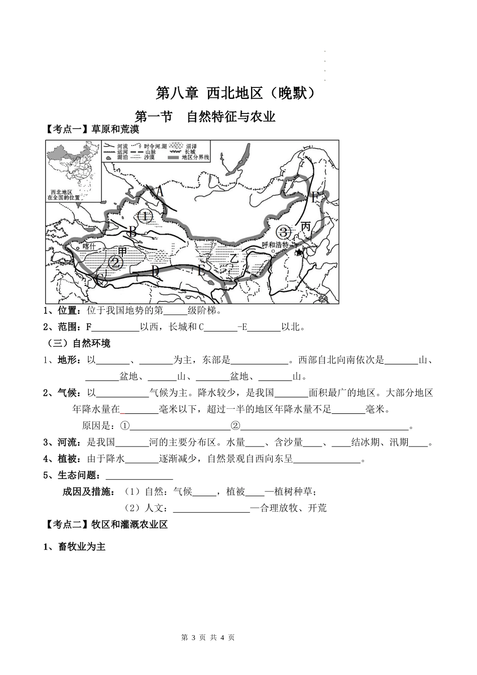 第1页共4页第八章西北地区(晨读)第一节自然特征与农业【考点一】草原和荒漠(一)位置与范围1、位置:位于我国地势的第二级阶梯。2、范围:F大兴安岭以西,长城和C昆仑山-E祁连山以北。(二)自然环境1、地形:...