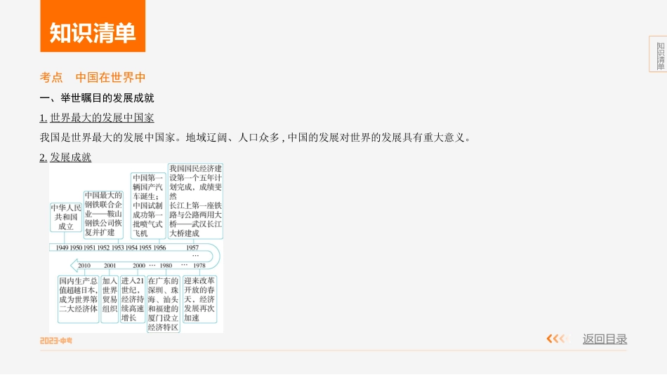 知识清单返回目录目录知识清单知识清单返回目录考点中国在世界中一、举世瞩目的发展成就1.世界最大的发展中国家我国是世界最大的发展中国家。地域辽阔、人口众多,中国的发展对世界的发展具有重大意义。2.发展成就...