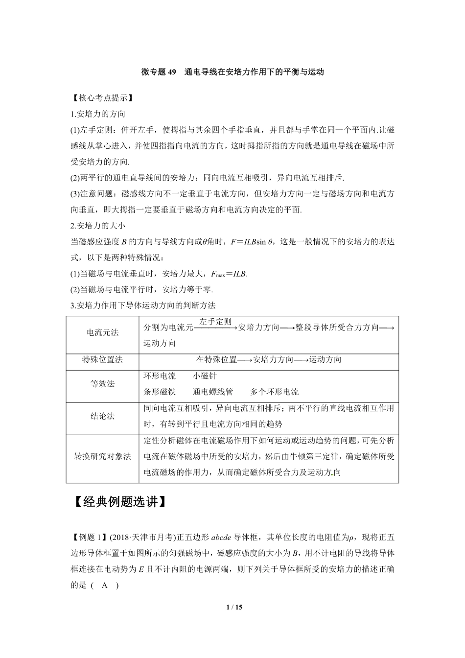 1/15微专题49通电导线在安培力作用下的平衡与运动【核心考点提示】1.安培力的方向(1)左手定则:伸开左手,使拇指与其余四个手指垂直,并且都与手掌在同一个平面内.让磁感线从掌心进入,并使四指指向电流的方向,...