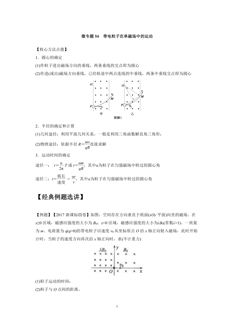 1微专题54带电粒子在单磁场中的运动【核心方法点拨】1.圆心的确定(1)作粒子进出磁场方向的垂线,两条垂线的交点即为圆心(2)作进(或出)磁场方向垂线,已经轨迹中两点连线的中垂线,两条中垂线交点即为圆心2.半径...