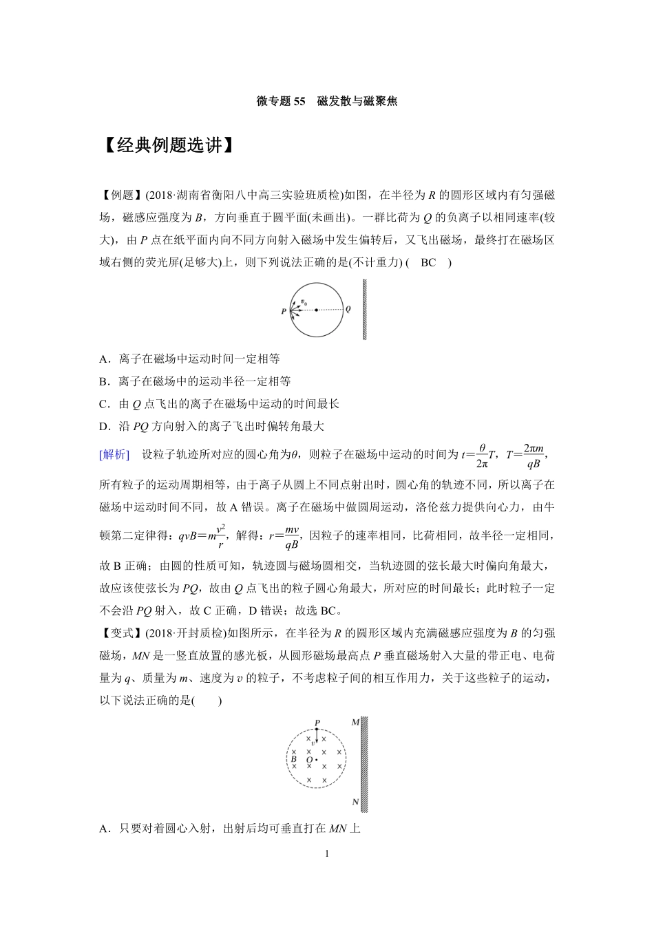 1微专题55磁发散与磁聚焦【经典例题选讲】【例题】(2018·湖南省衡阳八中高三实验班质检)如图,在半径为R的圆形区域内有匀强磁场,磁感应强度为B,方向垂直于圆平面(未画出)。一群比荷为Q的负离子以相同速率(较大...