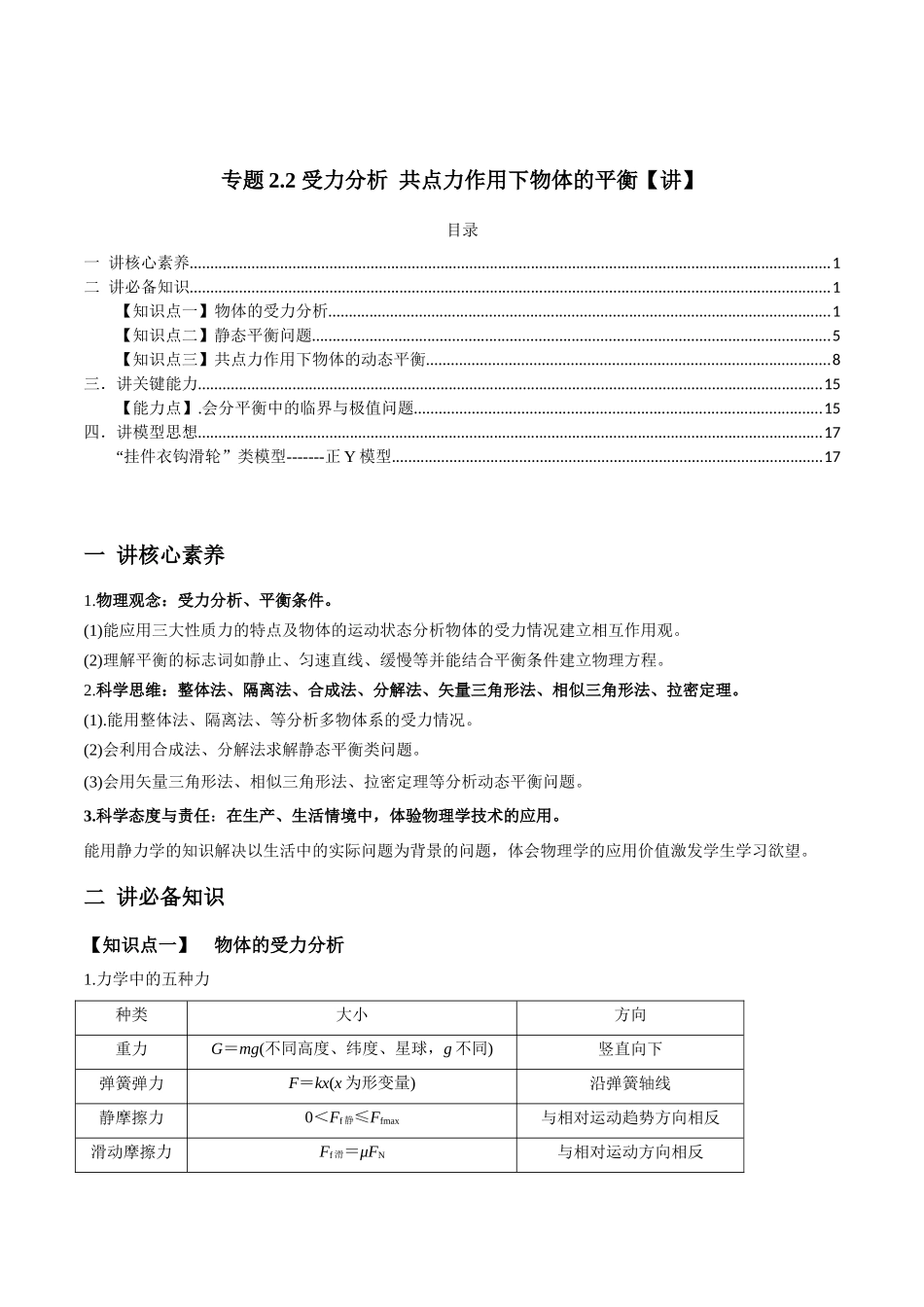 专题2.2受力分析共点力作用下物体的平衡【讲】目录一讲核心素养.............................................................................................................................................