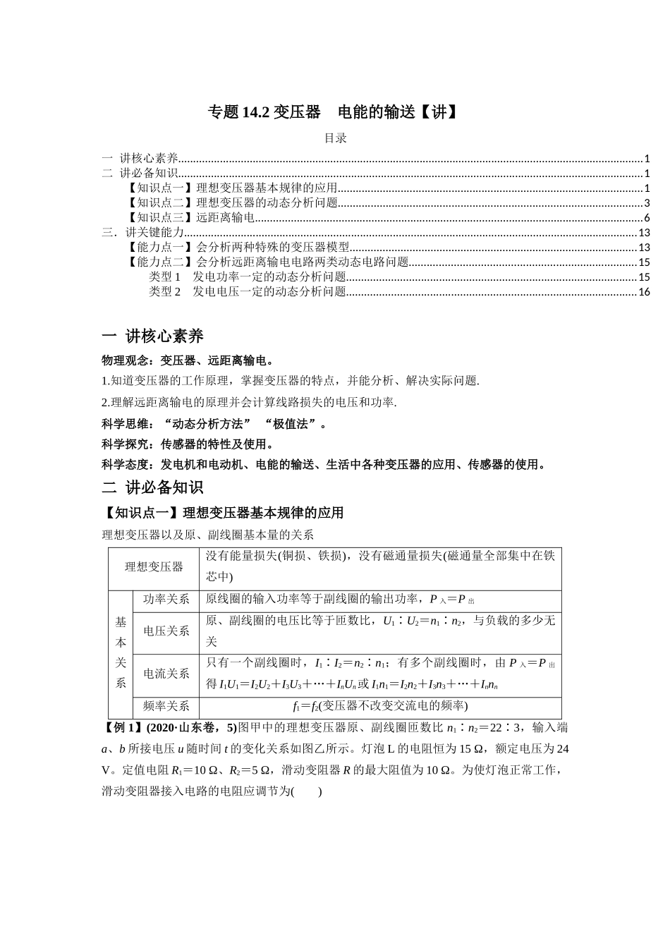 专题14.2变压器电能的输送【讲】目录一讲核心素养..........................................................................................................................................................