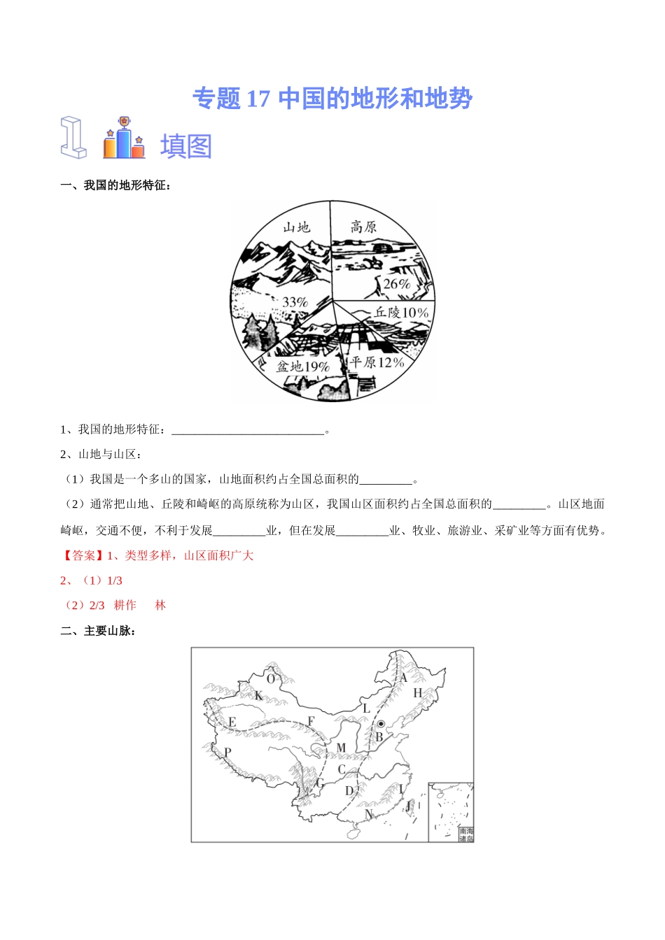专题17中国的地形和地势一、我国的地形特征:1、我国的地形特征:__________________________。2、山地与山区:(1)我国是一个多山的国家,山地面积约占全国总面积的_________。(2)通常把山地、丘陵和崎岖的高...