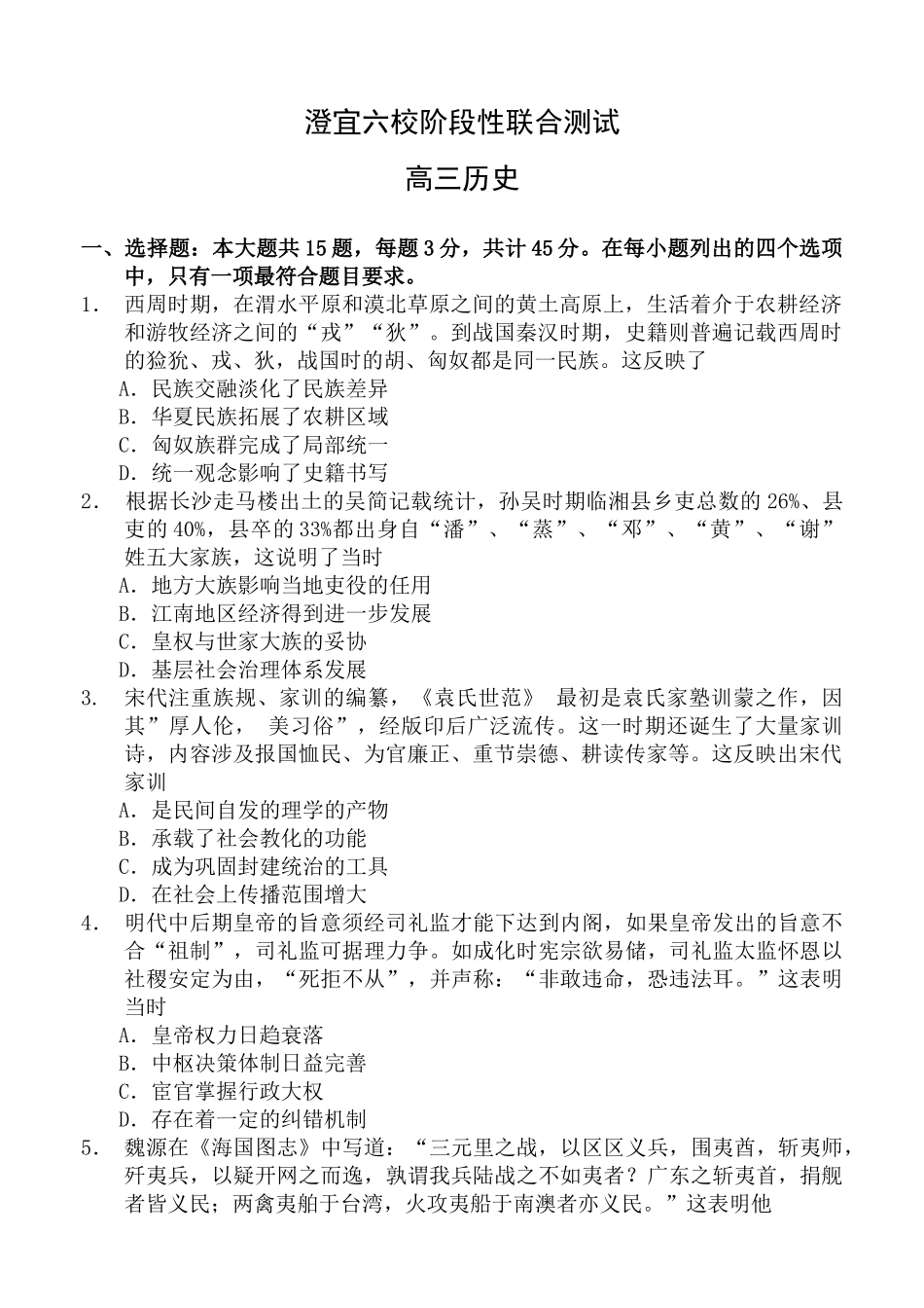 澄宜六校阶段性联合测试高三历史一、选择题:本大题共15题,每题3分,共计45分。在每小题列出的四个选项中,只有一项最符合题目要求。1.西周时期,在渭水平原和漠北草原之间的黄土高原上,生活着介于农耕经济和...
