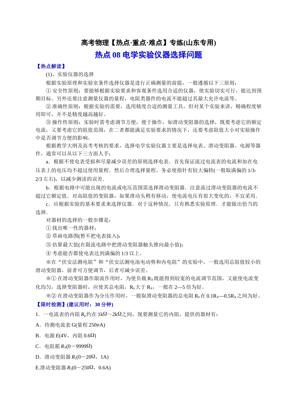 高考物理【热点·重点·难点】专练(山东专用)热点08电学实验仪器选择问题【热点解读】(1)、实验仪器的选择根据实验原理和实验室条件选择仪器是进行正确测量的前提,一般遵循以下三原则:①安全性原则:要能够根据...