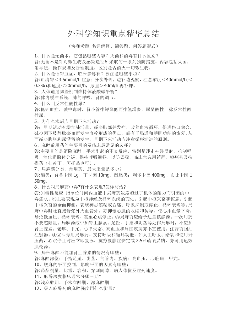 外科学知识重点精华总结(协和考题名词解释、简答题、问答题形式)1、什么是无菌术,它包括哪些内容?灭菌和消毒有什么区别?答:无菌术是针对微生物及感染途径所采取的一系列预防措施。内容包括灭菌,消毒法,操...