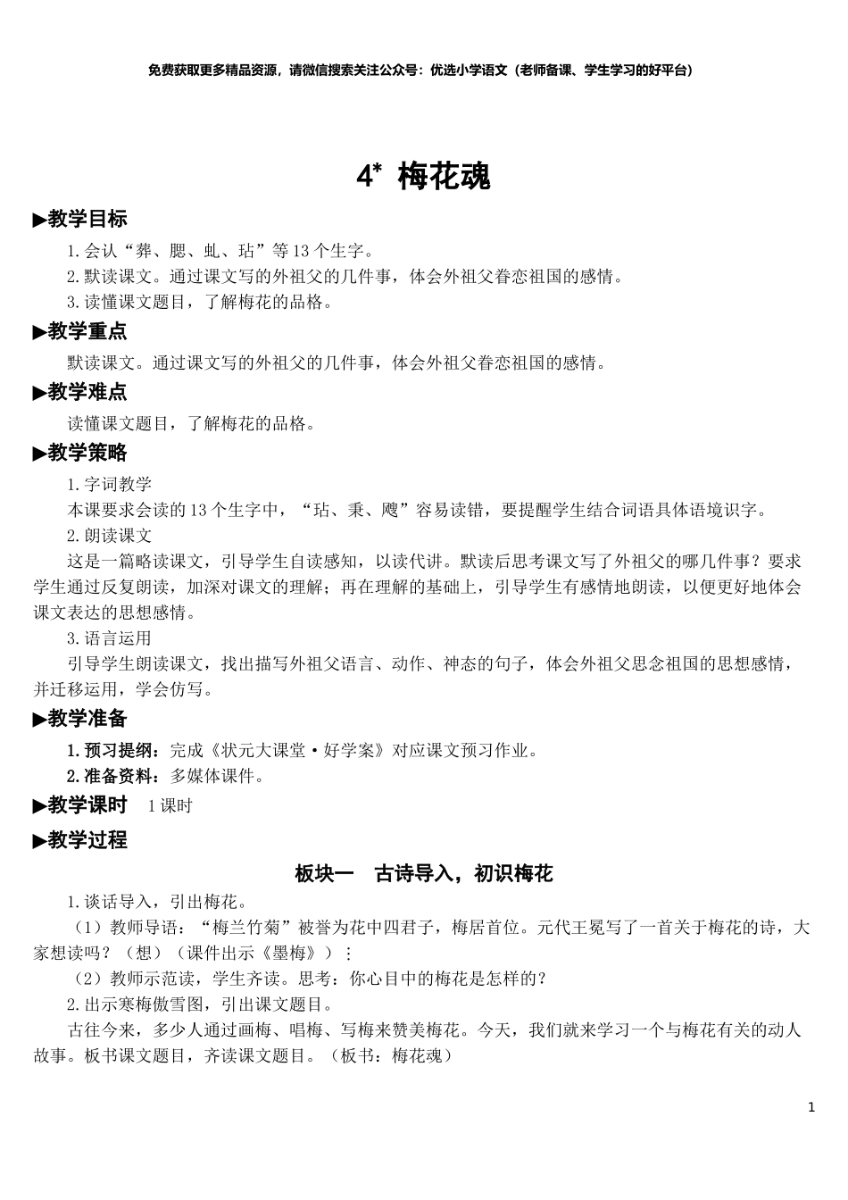 免费获取更多精品资源,请微信搜索关注公众号:优选小学语文(老师备课、学生学习的好平台)4*梅花魂▶教学目标1.会认“葬、腮、虬、玷”等13个生字。2.默读课文。通过课文写的外祖父的几件事,体会外祖父眷恋祖...