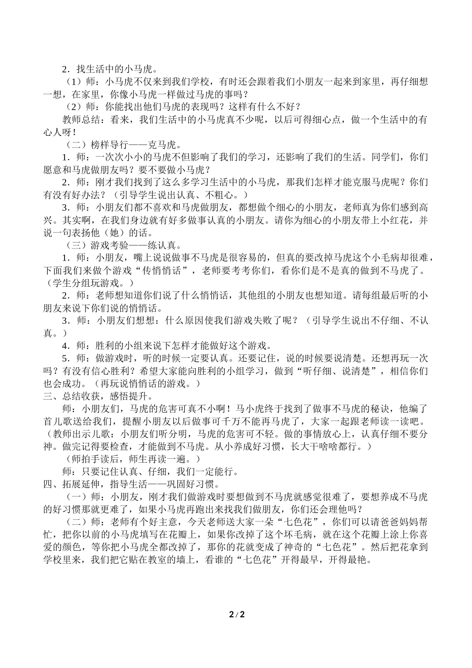 不做“小马虎”【教学目标】1.做事情有认真负责的态度。2.初步养成做事认真细致的习惯。3.知道要认真完成自己承担的任务。4.学习使用交流、讨论等方法,体验探究的过程。【教学重难点】知道要认真完成自己承...