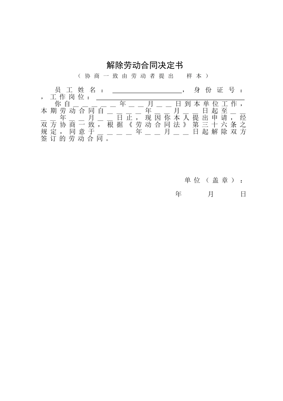 解除劳动合同决定书(协商一致由劳动者提出样本)员工姓名:,身份证号:,工作岗位:你自_____年__月__日到本单位工作,本期劳动合同自____年__月__日起至____年__月__日止,现因你本...