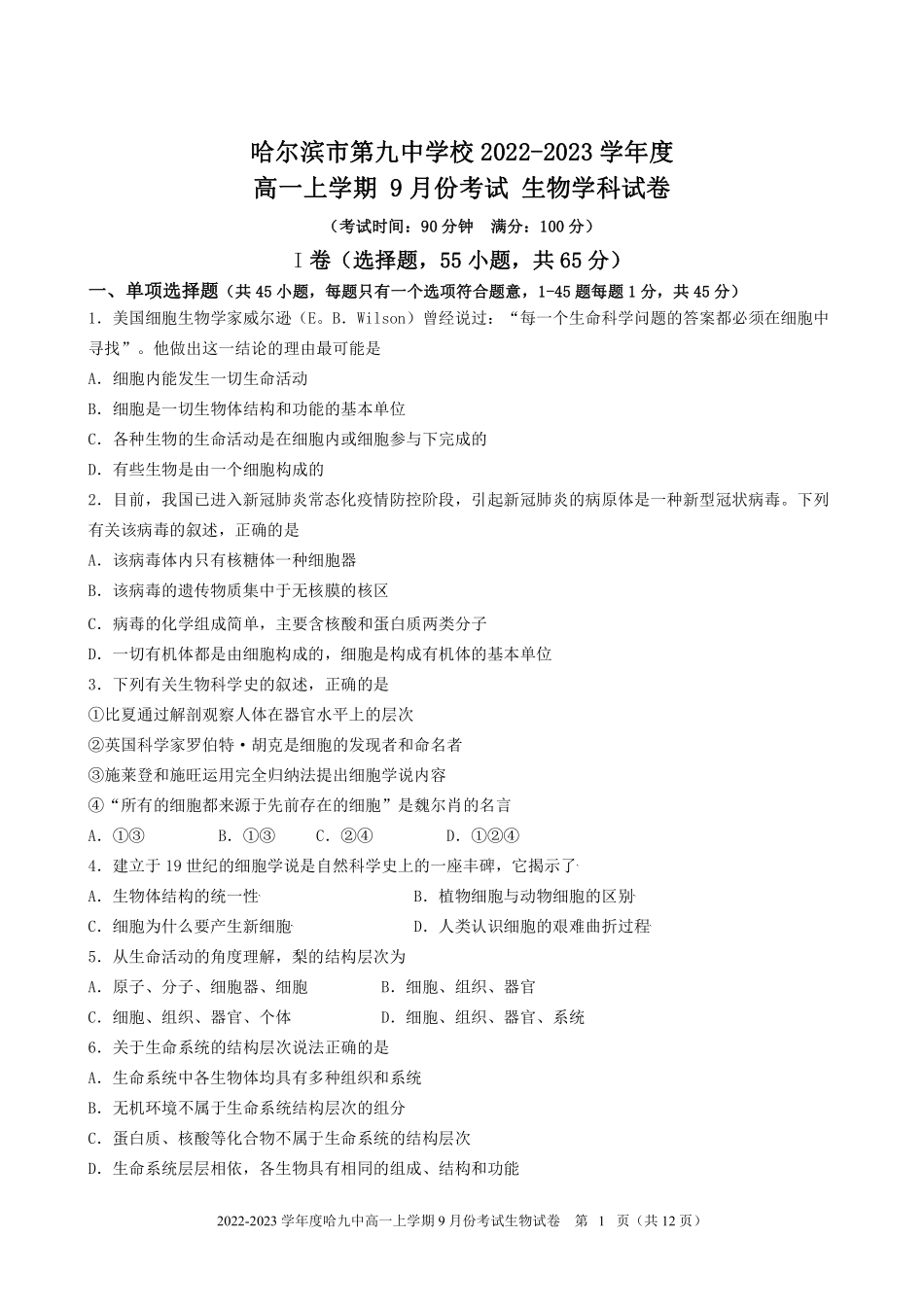 2022-2023学年度哈九中高一上学期9月份考试生物试卷第页(共12页)1哈尔滨市第九中学校2022-2023学年度高一上学期9月份考试生物学科试卷(考试时间:90分钟满分:100分)I卷(选择题,55小题,共65分)一、单项选...