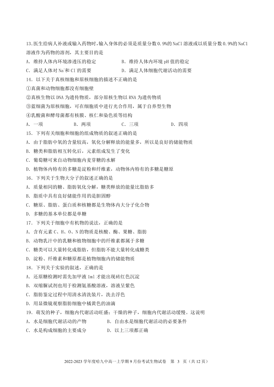 高一上9月月考生物试题 A4.pdf_第3页
