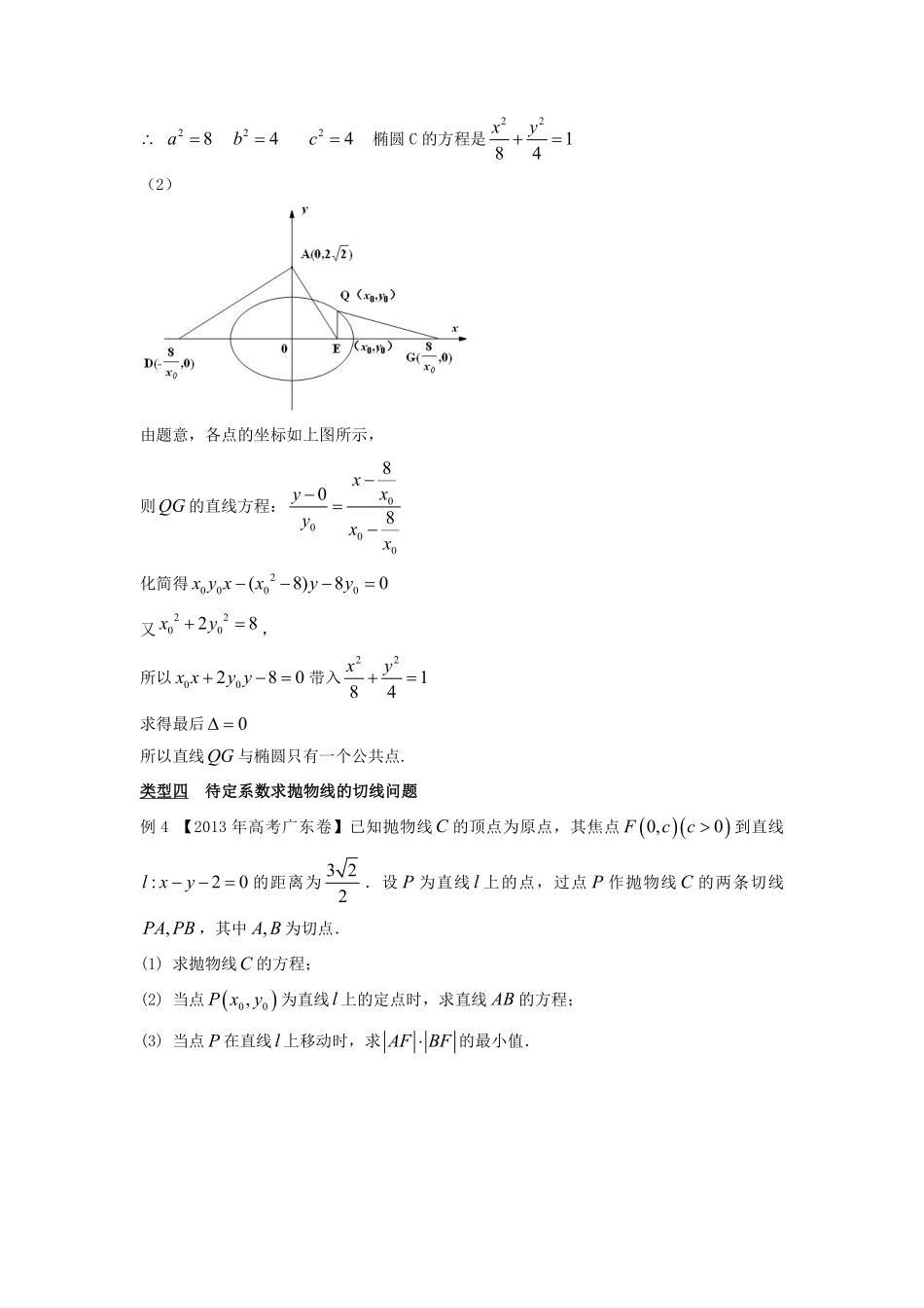 圆锥曲线的切线问题圆锥曲线的切线问题有两种处理思路:思路1,导数法,将圆锥曲线方程化为函数)(xfy,利用导数法求出函数)(xfy在点),(00yx处的切线方程,特别是焦点在y轴上常用此法求切线;思路2,根据题中...