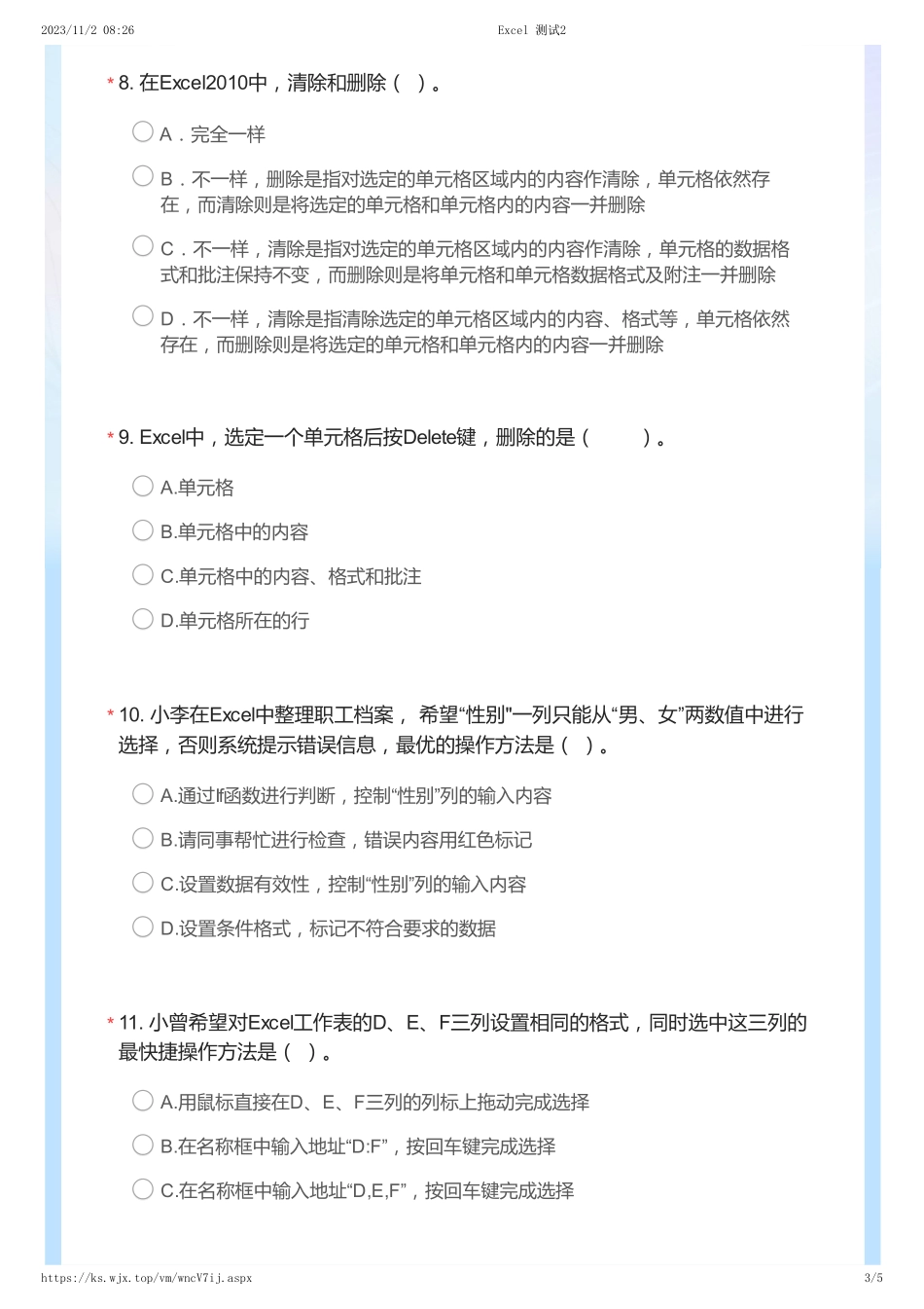 2023/11/208:26Excel测试2https://ks.wjx.top/vm/wncV7ij.aspx1/5Excel测试21.Excel2010中要,若要同时选定B2:C6和E1:F2,下列正确的操作是()。*A.按住鼠标左键从B2拖动到C6,然后按住鼠标左键从E1拖动到F2B....