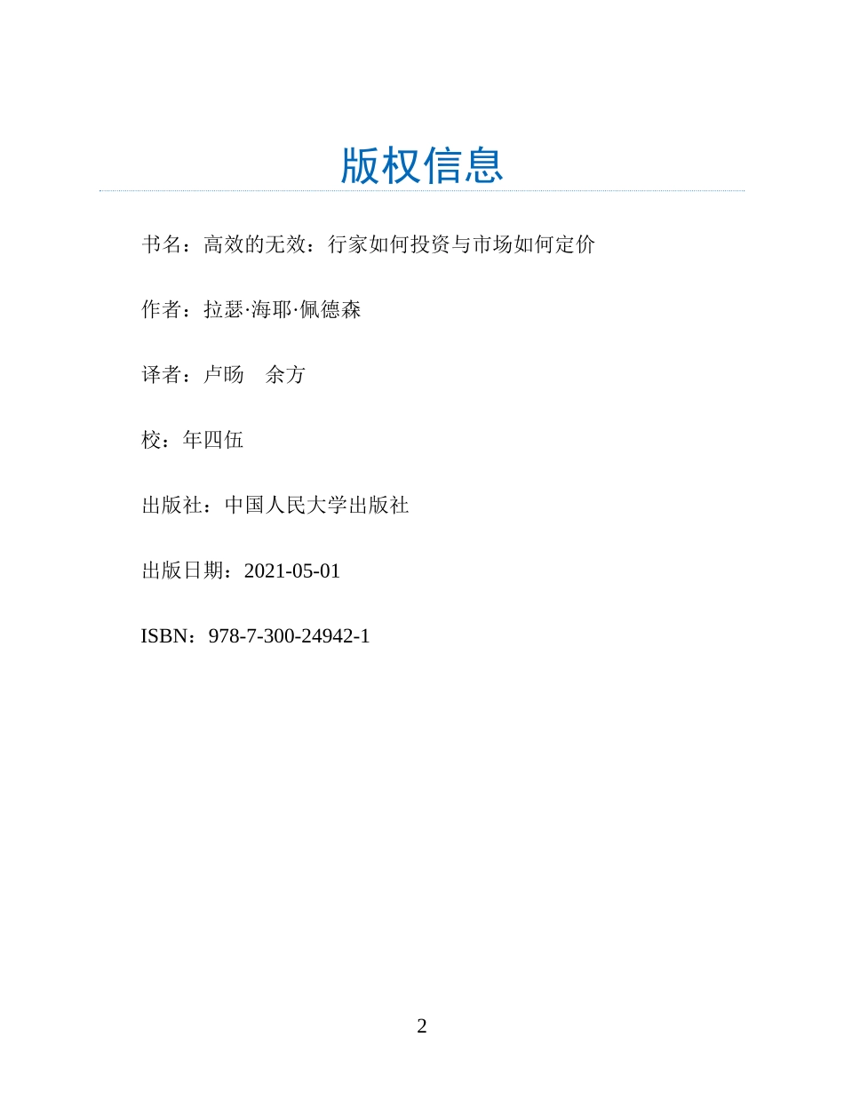 版权信息书名:高效的无效:行家如何投资与市场如何定价作者:拉瑟·海耶·佩德森译者:卢旸余方校:年四伍出版社:中国人民大学出版社出版日期:2021-05-01ISBN:978-7-300-24942-12目录CONTENTS序言致谢作者介...